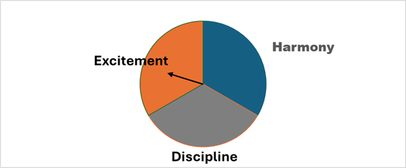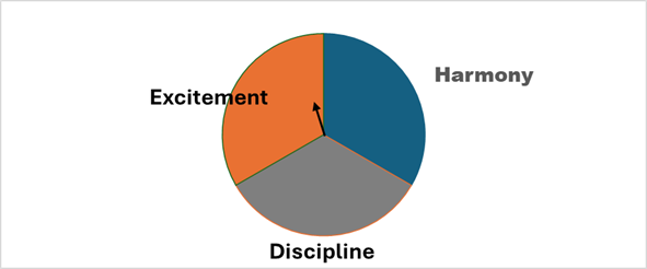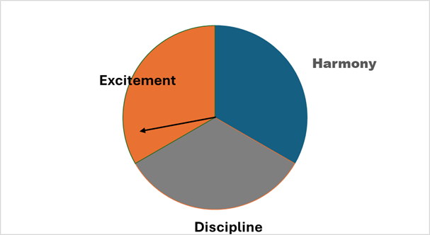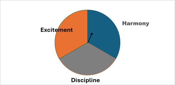 [1] This is because whatever represents harmony, be it steady income, organic agriculture, good air and water quality, good participation in primary school education, charity organisations – they re-enforce each other. Similarly, the many indicators of discipline re-enforce each other – sickness, death, domestic and street violence, repressive police and army, armaments, polluted air and water, bankruptcy, crime. Similarly, excitement indicators re-enforce each other be they from the economy, society or nature – any flux and change brings the unknown. Even positive change in the economy (growth of GDP per capita) brings an instability, who invests in what is unpredictable. Changes in governance structures, sports competition, festivities and changes in agricultural practices all belong in excitement and they reenforce the instability in other areas. From excitement, the compass can rotate towards discipline or harmony.