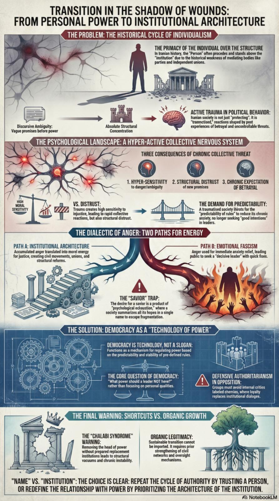 In modern Iranian history, the “individual” has often emerged before the “institution” and stood above it. This primacy has not merely been a cultural trait; it has also resulted from the historical weakness of intermediary institutions: stable political parties, independent unions, free media, professional associations, and mechanisms for distributing power. Whenever these mediating institutions have been weak, the resulting vacuum has been filled by a single figure.